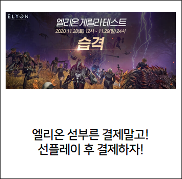 제목으로 어그로 끌어서 미안하다라는 말씀을 먼저 드리고 시작하고 싶다. 우선 엘리온을 결제하기에 앞서 28-29일 양일간 게릴라 플레이를 해볼 수가 있기 때문에 이런 표현을 쓴 것이었다.